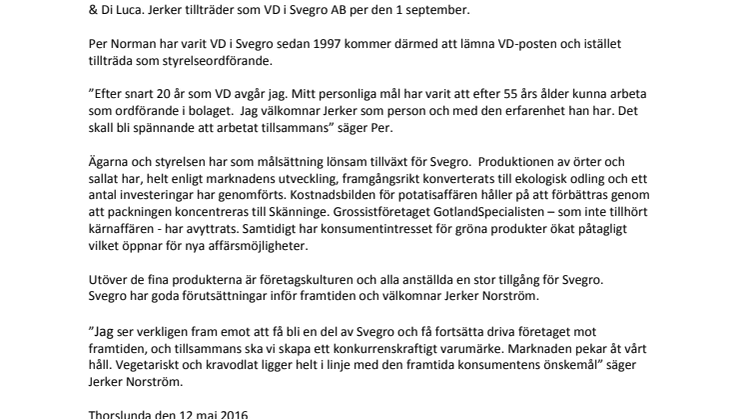 Med familjeägandet i ryggen och med värdeorden matglädje, mod, handlingskraft, kompetens och äkthet som ledstjärnor vill vi välkomna Jerker Norström som ny VD i Svegro.