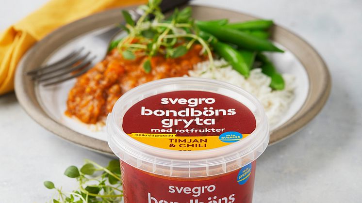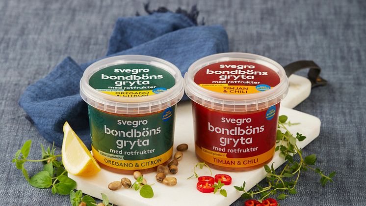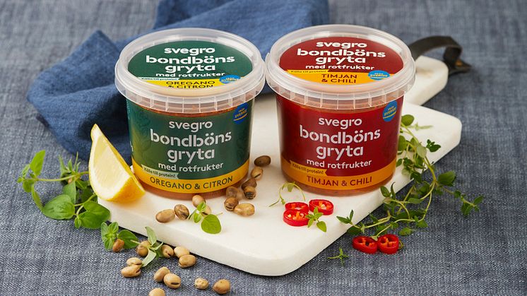 Nu lanserar Svegro den veganska nyheten Bondbönsgryta – en god och näringsrik gryta full av fiber och protein, som lagats på en bas av svenska bondbönor och rotfrukter med en fyllig smak av gröna örter. Grytan är färdig att värmas och kommer i två härliga och inspirerande smaker; Timjan & Chili och Oregano & Citron.