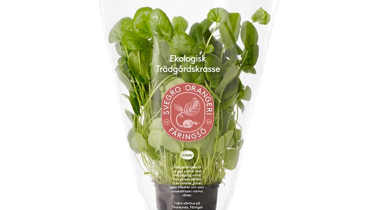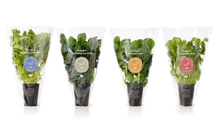 Svegro Orangeri sortimentet - Ekologisk Finbladig Grönkål, Ekologisk Finbladig Svartkål, Ekologisk Asiatisk Tatsoi och Ekologisk Trädgårdskrasse finns i välsorterade butiker från och med vecka 17 2016. Rekommenderat försäljningspris är ca 25 kr per kruka.
