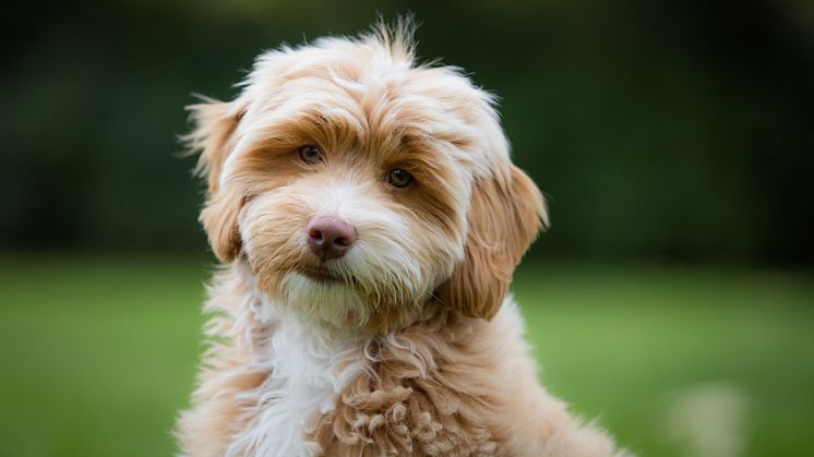 Här är Bella - månadens fyrfota medarbetare för augusti. Hon är en 15 veckor gammal cockerpoo som följer med sin matte Linda, som jobbar som ekonomichef på Sveland Djurförsäkringar, till kontoret varje dag.