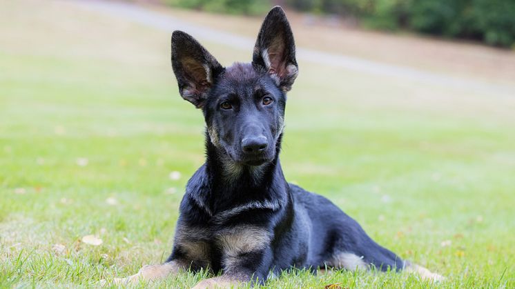 Månadens fyrfota medarbetare för september är schäfervalpen Leffe. Han är fyra månader gammal och följer med produktspecialisten Christine till jobbet på Sveland Djurförsäkringar.