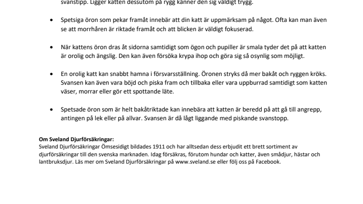 - Kattöron som avslappnat pekar framåt och aningen utåt i kombination med att katten spinner betyder att din katt är lugn och tillfreds. Ofta är då även svansen upprätt och har en något böjd svanstipp. Ligger katten dessutom på rygg känner den sig väldigt trygg.