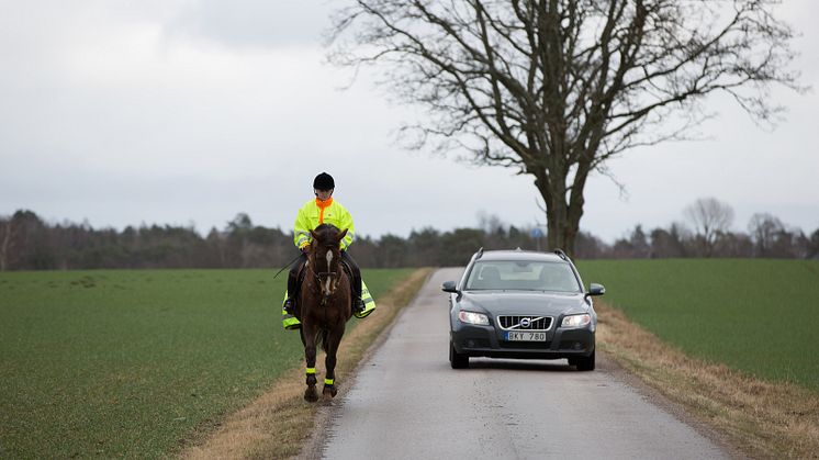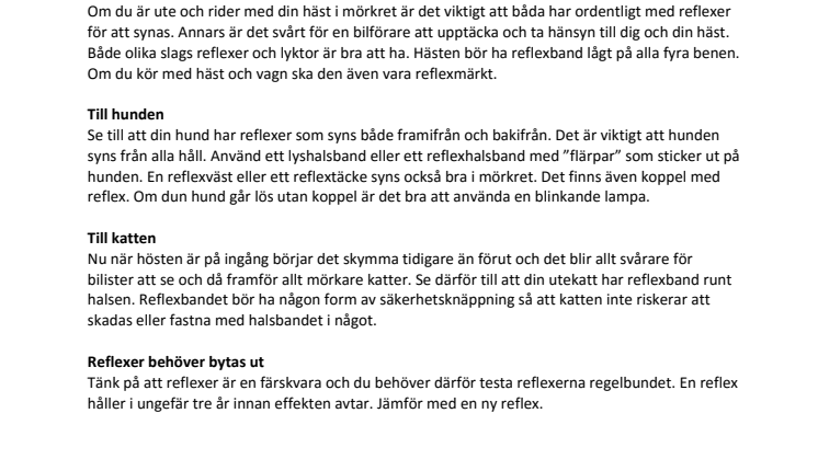 Om du är ute och rider med din häst i mörkret är det viktigt att båda har ordentligt med reflexer för att synas. Annars är det svårt för en bilförare att upptäcka och ta hänsyn till dig och din häst. Både olika slags reflexer och lyktor är bra att ha. Hästen bör ha reflexband lågt på alla fyra benen. Om du kör med häst och vagn ska den även vara reflexmärkt.