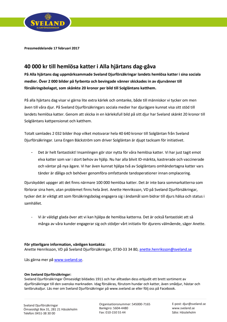 På Alla hjärtans dag uppmärksammade Sveland Djurförsäkringar landets hemlösa katter i sina sociala medier. Över 2 000 bilder på fyrbenta och bevingade vänner skickades in av djurvänner till försäkringsbolaget, som skänkte 20 kronor per bild till Solgläntans katthem.