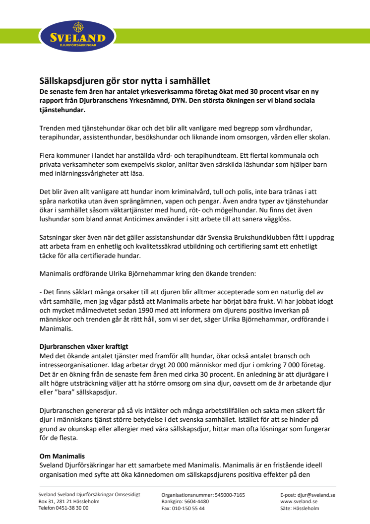 Djur i människans tjänst blir allt vanligare. En ny rapport från Djurbranschens Yrkesnämnd, DYN, visar att antalet yrkesverksamma företag har ökat med 30 procent de senaste fem åren. Den största ökningen ser vi bland sociala tjänstehundar.