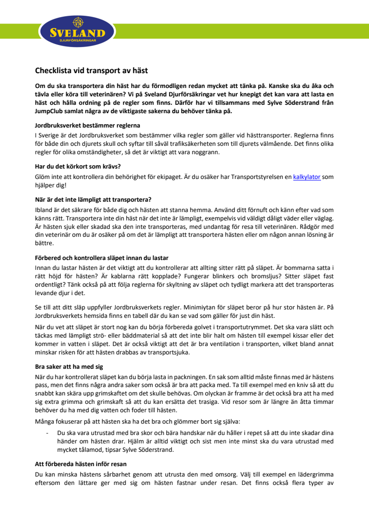 Om du ska transportera din häst har du förmodligen redan mycket att tänka på. Kanske ska du åka och tävla eller köra till veterinären? Vi på Sveland Djurförsäkringar vet hur knepigt det kan vara att lasta en häst och hålla ordning på de regler som finns. Därför har vi tillsammans med Sylve Söderstrand från JumpClub samlat några av de viktigaste sakerna du behöver tänka på.