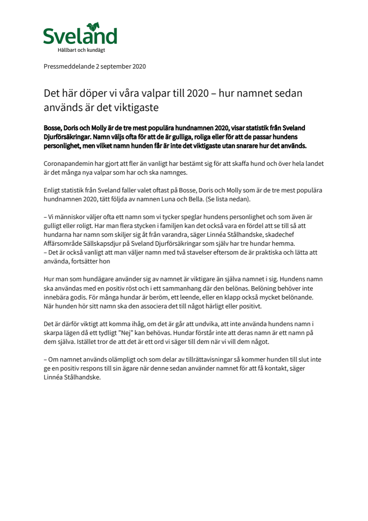 Bosse, Doris och Molly är de tre mest populära hundnamnen 2020, visar statistik från Sveland Djurförsäkringar. Namn väljs ofta för att de är gulliga, roliga eller för att de passar hundens personlighet, men vilket namn hunden får är inte det viktigaste utan snarare hur det används.