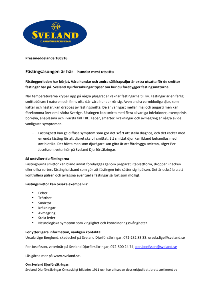 Fästingperioden har börjat. Våra hundar och andra sällskapsdjur är extra utsatta för de smittor fästingar bär på. Sveland Djurförsäkringar tipsar om hur du förebygger fästingsmittorna.