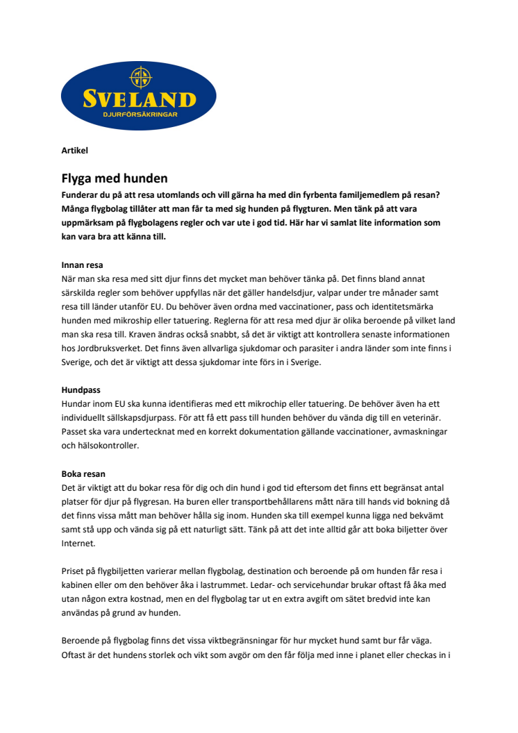 Funderar du på att resa utomlands och vill gärna ha med din fyrbenta familjemedlem på resan? Många flygbolag tillåter att man får ta med sig hunden på flygturen. Men tänk på att vara uppmärksam på flygbolagens regler och var ute i god tid. Här har vi samlat lite information som kan vara bra att känna till.