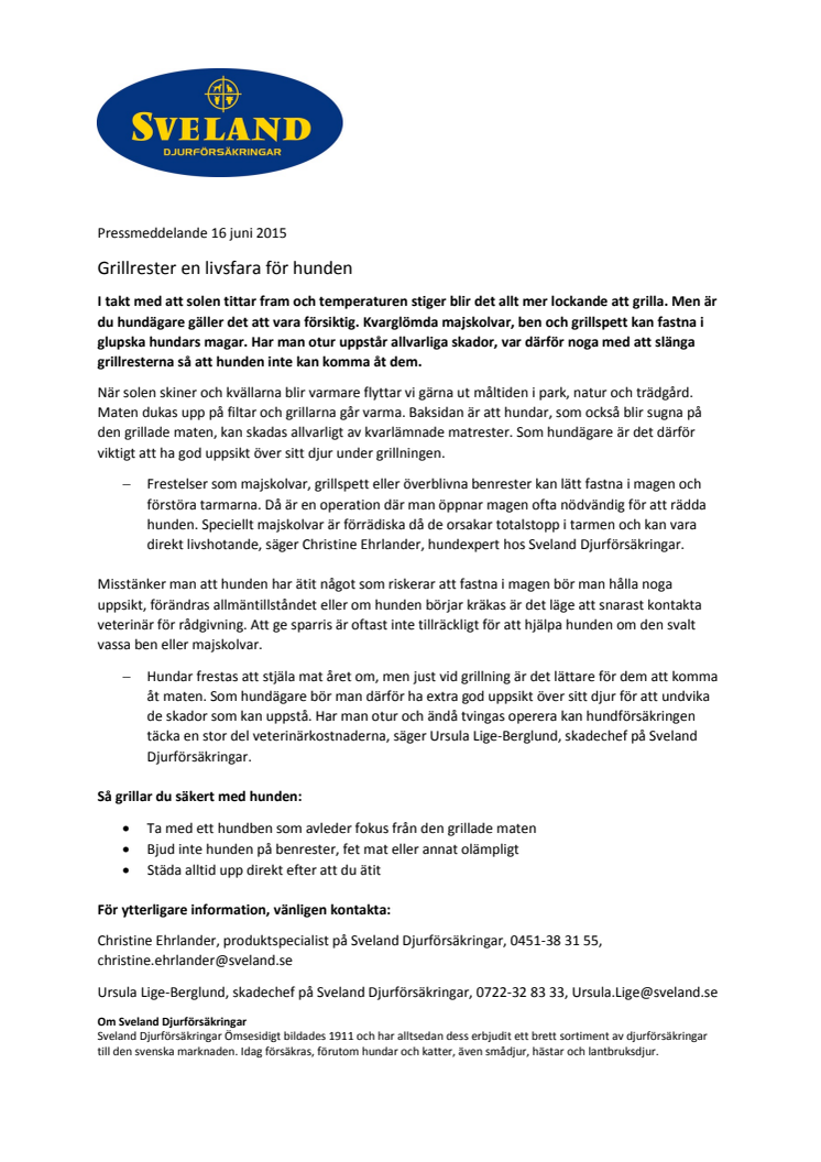 I takt med att solen tittar fram och temperaturen stiger blir det allt mer lockande att grilla. Men är du hundägare gäller det att vara försiktig. Kvarglömda majskolvar, ben och grillspett kan fastna i glupska hundars magar. Har man otur uppstår allvarliga skador, var därför noga med att slänga grillresterna så att hunden inte kan komma åt dem.