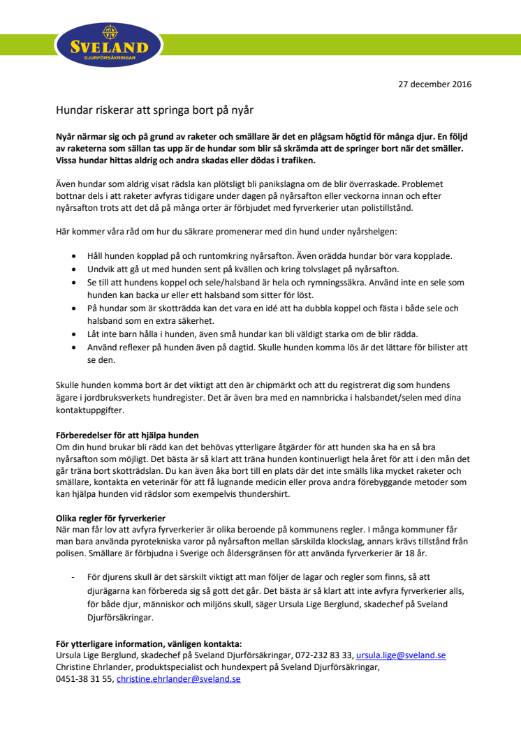 Nyår närmar sig och på grund av raketer och smällare är det en plågsam högtid för många djur. En följd av raketerna som sällan tas upp är de hundar som blir så skrämda att de springer bort när det smäller. Vissa hundar hittas aldrig och andra skadas eller dödas i trafiken.