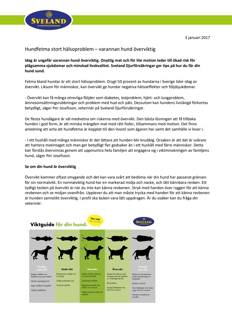 Idag är ungefär varannan hund överviktig. Onyttig mat och för lite motion leder till ökad risk för plågsamma sjukdomar och minskad livskvalitet. Sveland Djurförsäkringar ger tips på hur du får din hund sund.