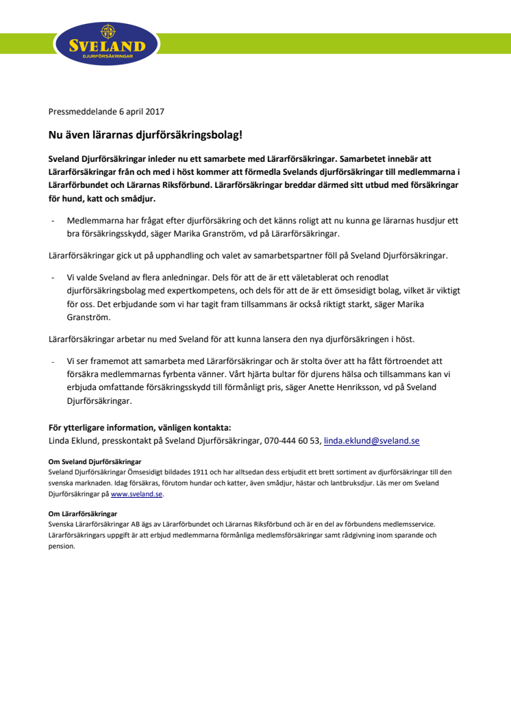 Sveland Djurförsäkringar inleder nu ett samarbete med Lärarförsäkringar. Samarbetet innebär att Lärarförsäkringar från och med i höst kommer att förmedla Svelands djurförsäkringar till medlemmarna i Lärarförbundet och Lärarnas Riksförbund. Lärarförsäkringar breddar därmed sitt utbud med försäkringar för hund, katt och smådjur.