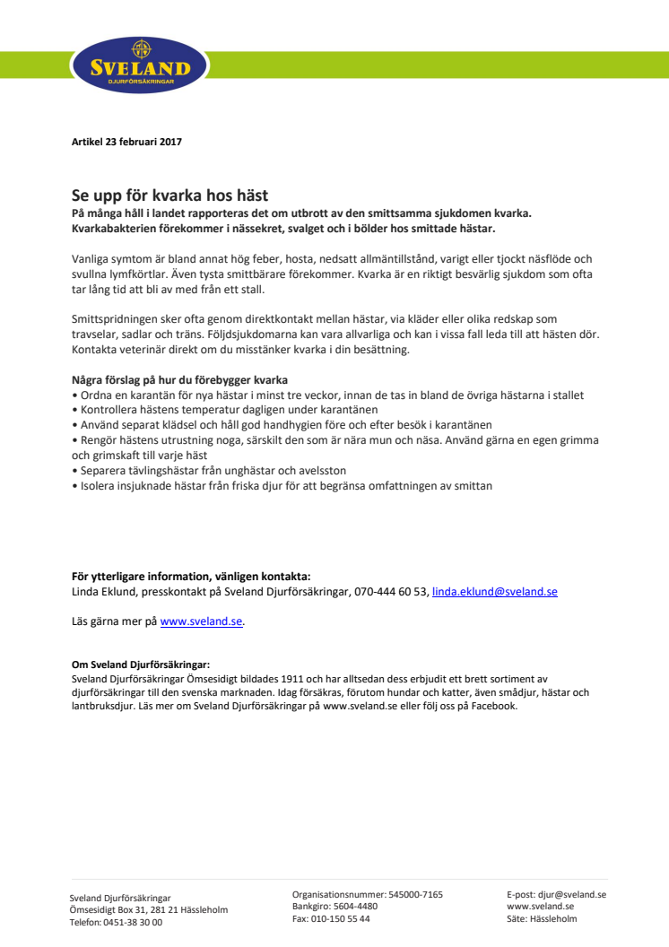 På många håll i landet rapporteras det om utbrott av den smittsamma sjukdomen kvarka. Kvarkabakterien förekommer i nässekret, svalget och i bölder hos smittade hästar.