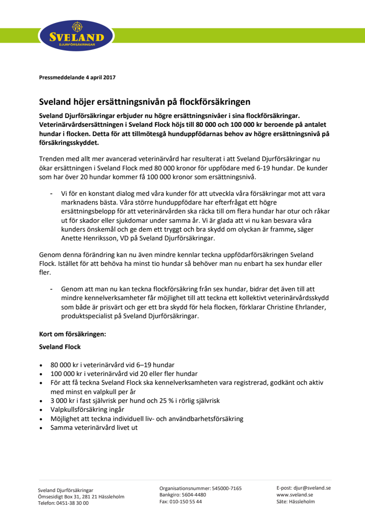 Sveland Djurförsäkringar erbjuder nu högre ersättningsnivåer i sina flockförsäkringar. Veterinärvårdsersättningen i Sveland Flock höjs till 80 000 och 100 000 kr beroende på antalet hundar i flocken. Detta för att tillmötesgå hunduppfödarnas behov av högre ersättningsnivå på försäkringsskyddet.