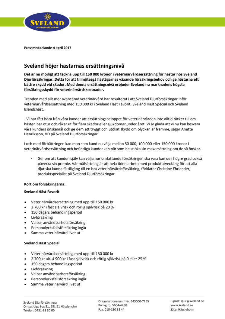 Det är nu möjligt att teckna upp till 150 000 kronor i veterinärvårdsersättning för hästar hos Sveland Djurförsäkringar. Detta för att tillmötesgå hästägarnas växande försäkringsbehov och ge hästarna ett bättre skydd vid skador. Med denna ersättningsnivå erbjuder Sveland nu marknadens högsta försäkringsskydd för veterinärvårdskostnader.