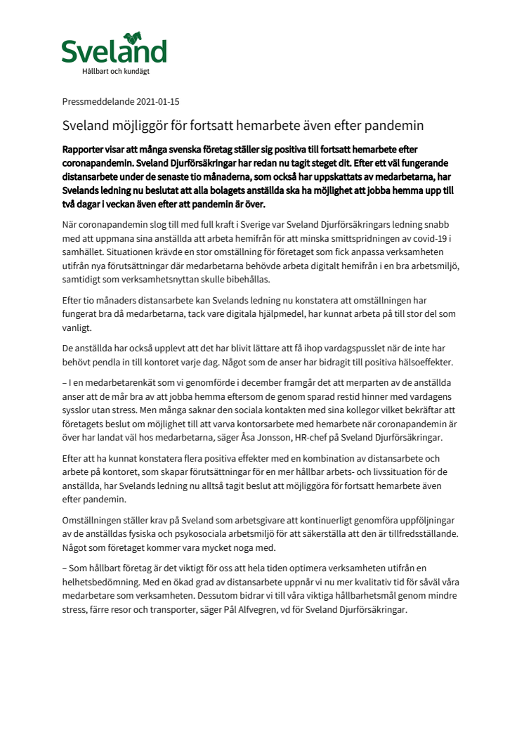 Rapporter visar att många svenska företag ställer sig positiva till fortsatt hemarbete efter coronapandemin. Sveland Djurförsäkringar har redan nu tagit steget dit. Efter ett väl fungerande distansarbete under de senaste tio månaderna har Svelands ledning nu beslutat att alla bolagets anställda ska ha möjlighet att jobba hemma upp till två dagar i veckan även efter att pandemin är över.