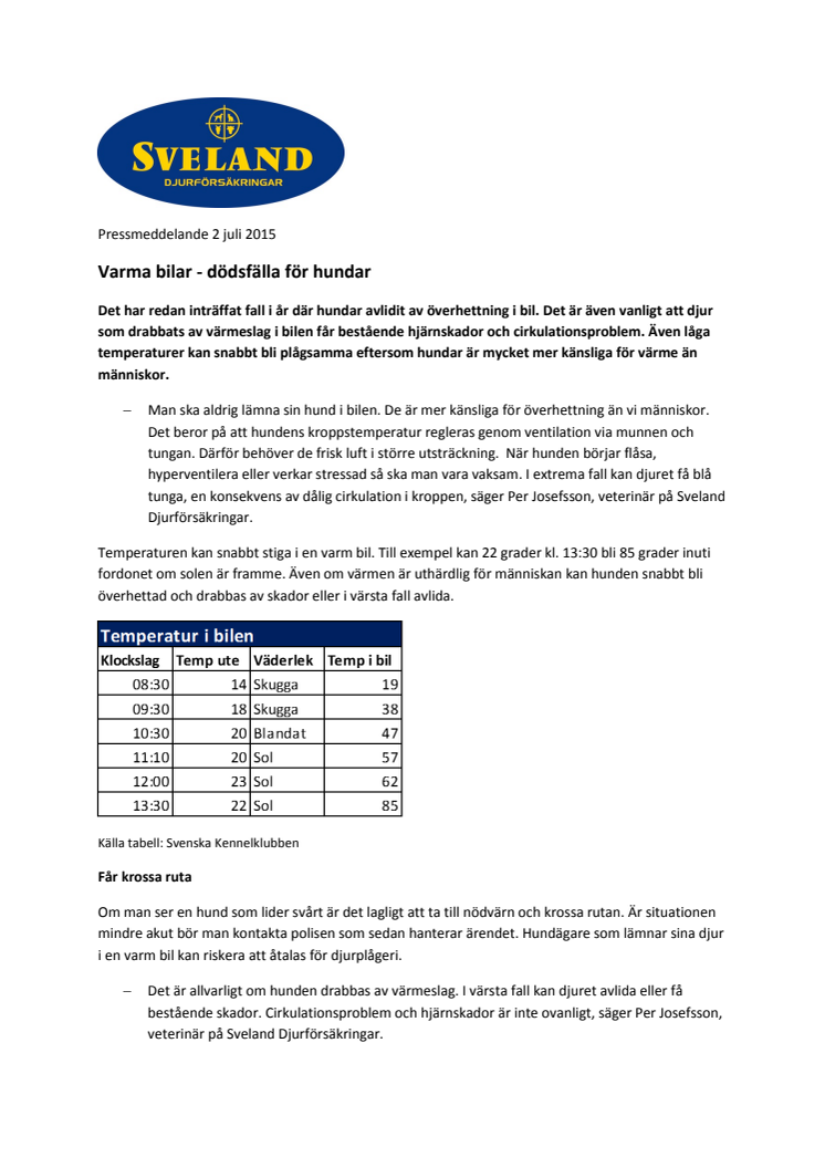 Det har redan inträffat fall i år där hundar avlidit av överhettning i bil. Det är även vanligt att djur som drabbats av värmeslag i bilen får bestående hjärnskador och cirkulationsproblem. Även låga temperaturer kan snabbt bli plågsamma eftersom hundar är mycket mer känsliga för värme än människor.