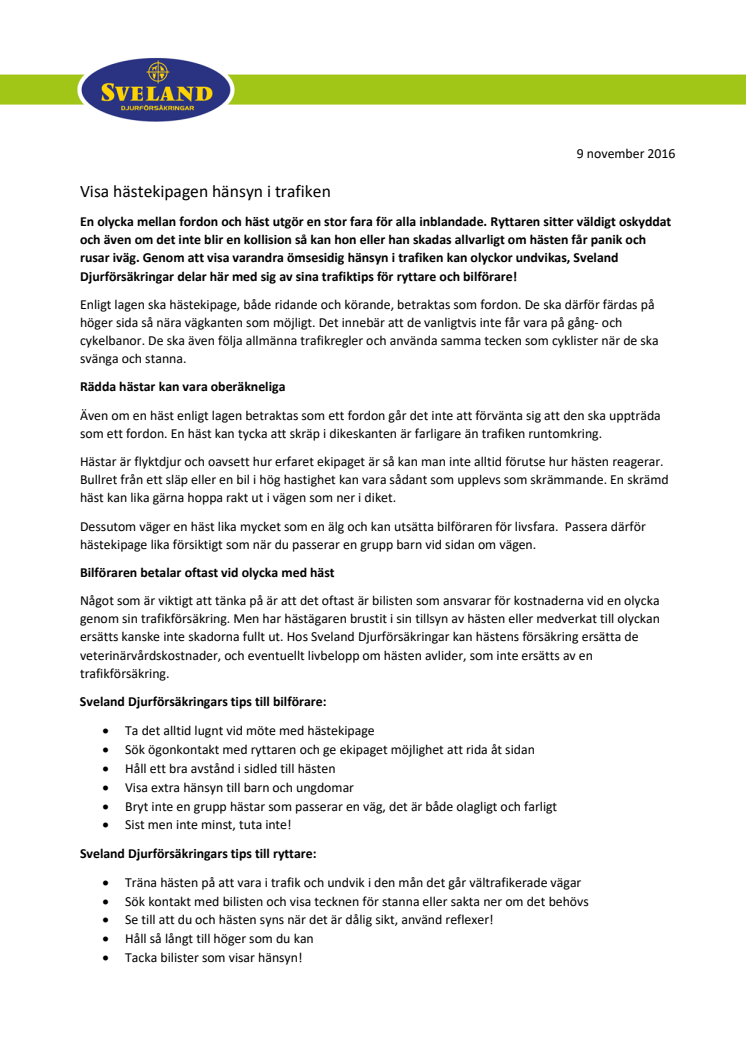En olycka mellan fordon och häst utgör en stor fara för alla inblandade. Ryttaren sitter väldigt oskyddat och även om det inte blir en kollision så kan hon eller han skadas allvarligt om hästen får panik och rusar iväg. Genom att visa varandra ömsesidig hänsyn i trafiken kan olyckor undvikas, Sveland Djurförsäkringar delar här med sig av sina trafiktips för ryttare och bilförare!