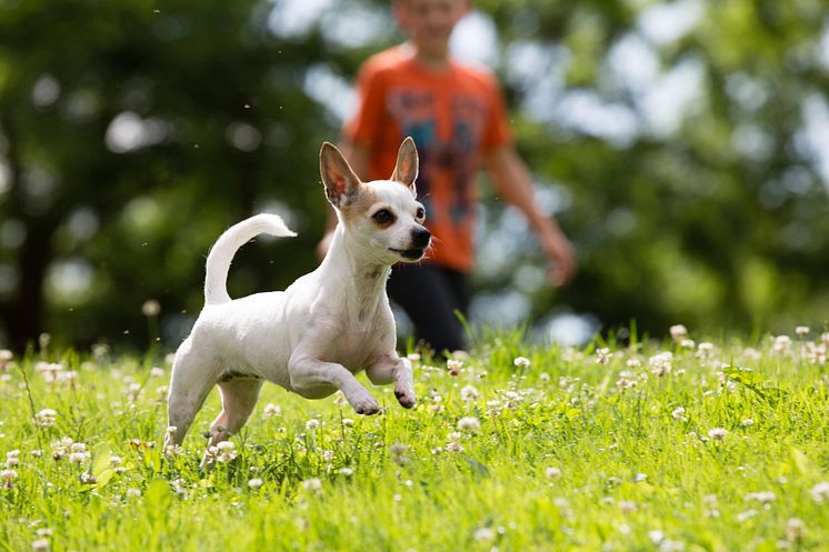 Chihuahuan Muffin leker på gräsmattan med sin lillhusse.