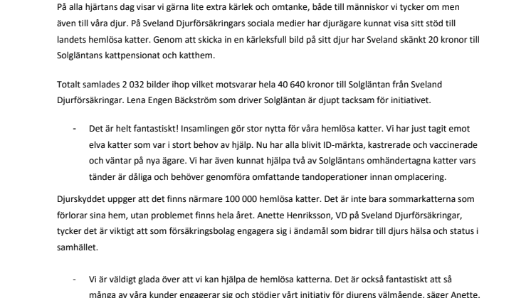 På Alla hjärtans dag uppmärksammade Sveland Djurförsäkringar landets hemlösa katter i sina sociala medier. Över 2 000 bilder på fyrbenta och bevingade vänner skickades in av djurvänner till försäkringsbolaget, som skänkte 20 kronor per bild till Solgläntans katthem.