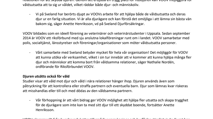 Den ideella organisationen VOOV (Veterinär Omtanke Om Våldsutsatta) underlättar för våldsutsatta att ta sig till skyddat boende genom att ta hand om deras husdjur i tillfälliga jourhem. Nu går Sveland Djurförsäkringar in som en av VOOVs huvudsponsorer och bidrar med försäkringar till husdjuren i kombination med medel för att hjälpa djur som behöver akut veterinärvård.