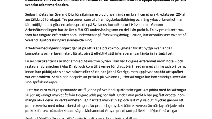 Sedan i höstas har Sveland Djurförsäkringar erbjudit nyanlända en kvalificerad praktikplats per 20-tal anställda på företaget. Tre personer, som alla har högskoleutbildning och lång yrkeserfarenhet, har fått möjlighet att göra en arbetspraktik på Svelands huvudkontor i Hässleholm. Genom Arbetsförmedlingen har de även fått SFI-undervisning som en del i sin praktik. En av praktikanterna, som har tidigare erfarenhet som underwriter på försäkringsbolag i Syrien, har anställts som vikarie på Sveland Djurförsäkringars skadeavdelning.