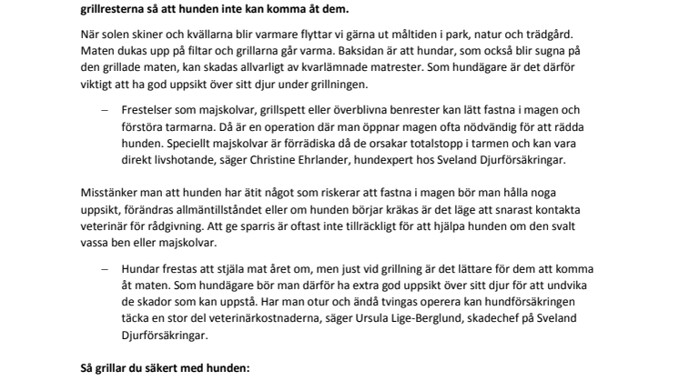 - Hundar frestas att stjäla mat året om, men just vid grillning är det lättare för dem att komma åt maten. Som hundägare bör man därför ha extra god uppsikt över sitt djur för att undvika de skador som kan uppstå. Har man otur och ändå tvingas operera kan hundförsäkringen täcka en stor del veterinärkostnaderna, säger Ursula Lige-Berglund, skadechef på Sveland Djurförsäkringar.