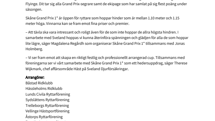 – Vi ser fram emot att skapa en riktigt festlig och professionellt arrangerad cup. Tillsammans med föreningarna ser vi vårt samarbete med Skåne Grand Prix 1* som ett hedersuppdrag, säger Therese Wijkmark, chef affärsområde Häst på Sveland Djurförsäkringar.