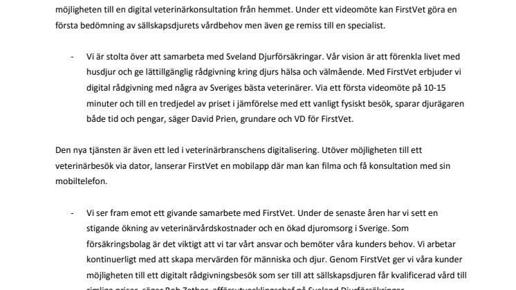 - Vi ser fram emot ett givande samarbete med FirstVet. Under de senaste åren har vi sett en stigande ökning av veterinärvårdskostnader och en ökad djuromsorg i Sverige. Som försäkringsbolag är det viktigt att vi tar vårt ansvar och bemöter våra kunders behov. Vi arbetar kontinuerligt med att skapa mervärden för människa och djur. Genom FirstVet ger vi våra kunder möjligheten till ett digitalt rådgivningsbesök som ser till att sällskapsdjuren får kvalificerad vård till rimliga priser, säger Bob Zether, affärsutvecklingschef på Sveland Djurförsäkringar.