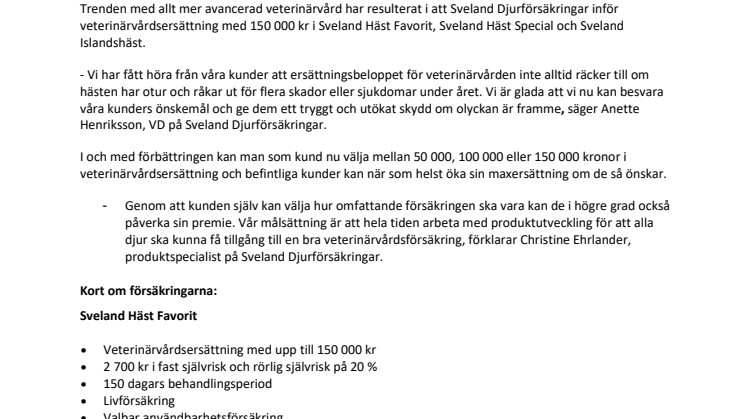 Trenden med allt mer avancerad veterinärvård har resulterat i att Sveland Djurförsäkringar inför veterinärvårdsersättning med 150 000 kronor i Sveland Häst Favorit, Sveland Häst Special och Sveland Islandshäst.