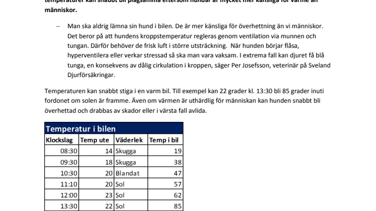- Man ska aldrig lämna sin hund i bilen. De är mer känsliga för överhettning än vi människor. Det beror på att hundens kroppstemperatur regleras genom ventilation via munnen och tungan. Därför behöver de frisk luft i större utsträckning.När hunden börjar flåsa, hyperventilera eller verkar stressad så ska man vara vaksam. I extrema fall kan djuret få blå tunga, en konsekvens av dålig cirkulation i kroppen, säger Per Josefsson, veterinär på Sveland Djurförsäkringar.
