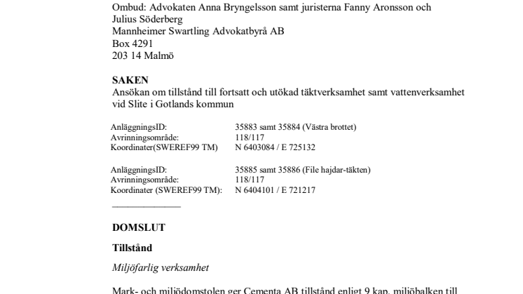 För bara en vecka sedan kom även domen från Högsta förvaltningsdomstolen som granskat om beslutet från riksdagen om det tillfälliga tillståndet var riktigt fattat. Domstolen slog fast att allt gått rätt till. Det tillståndet löper dock ut vid årsskiftet och fram till Cementa tar det nya, fyraåriga, tillståndet i bruk fortsätter verksamheten inom ramen för det tillfälliga tillståndet.
