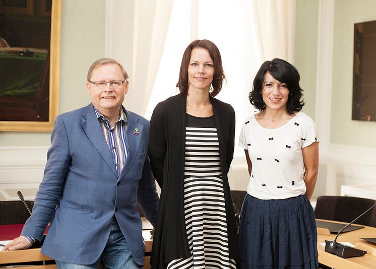 Från vänster: Jan Lindholm, ledamot i Civilutskottet MP, Veronica Palm, bostadspolitisk talesperson S och Amineh Kakabaveh, bostadspolitisk talesperson V.