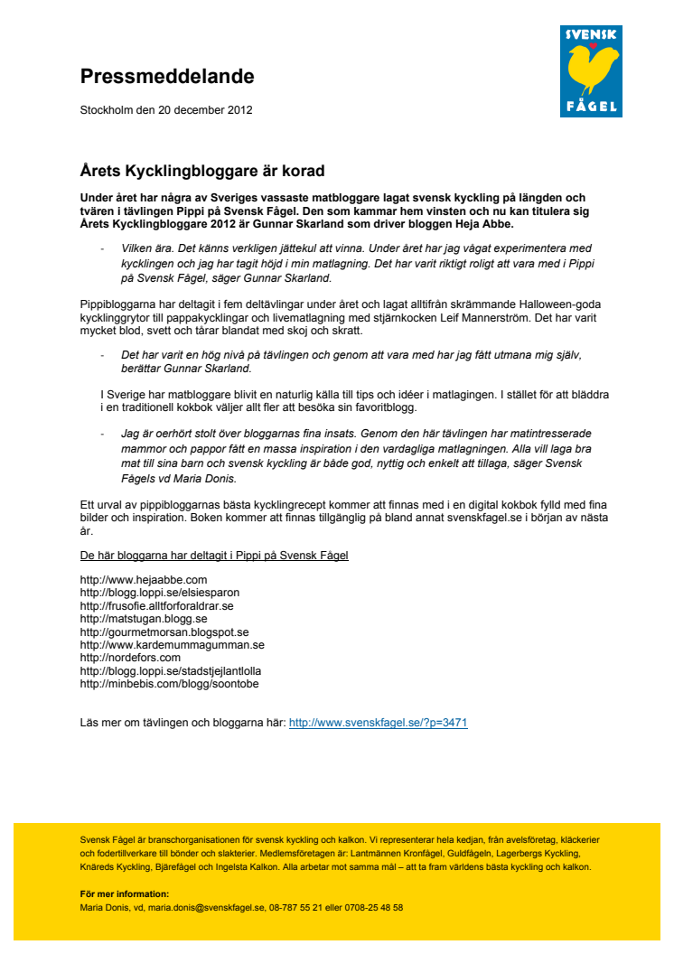 Under året har några av Sveriges vassaste matbloggare lagat svensk kyckling på längden och tvären i tävlingen Pippi på Svensk Fågel. Den som kammar hem vinsten och nu kan titulera sig Årets Kycklingbloggare 2012 är Gunnar Skarland som driver bloggen Heja Abbe.
