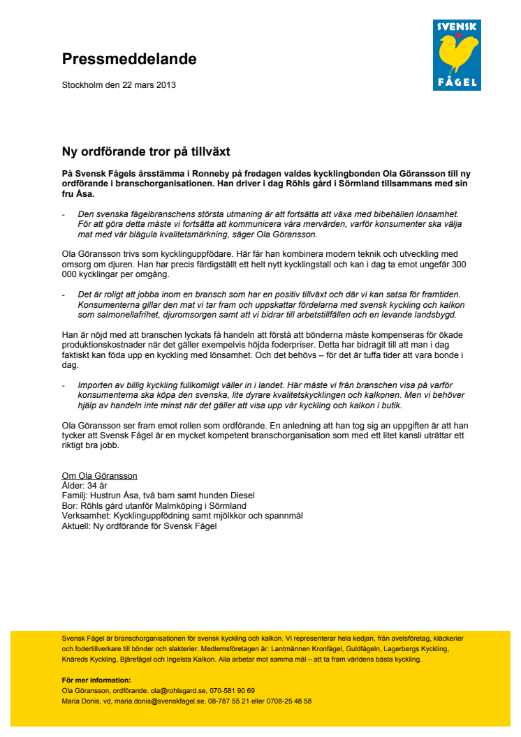 På Svensk Fågels årsstämma i Ronneby på fredagen valdes kycklingbonden Ola Göransson till ny ordförande i branschorganisationen. Han driver i dag Röhls gård i Sörmland tillsammans med sin fru Åsa.