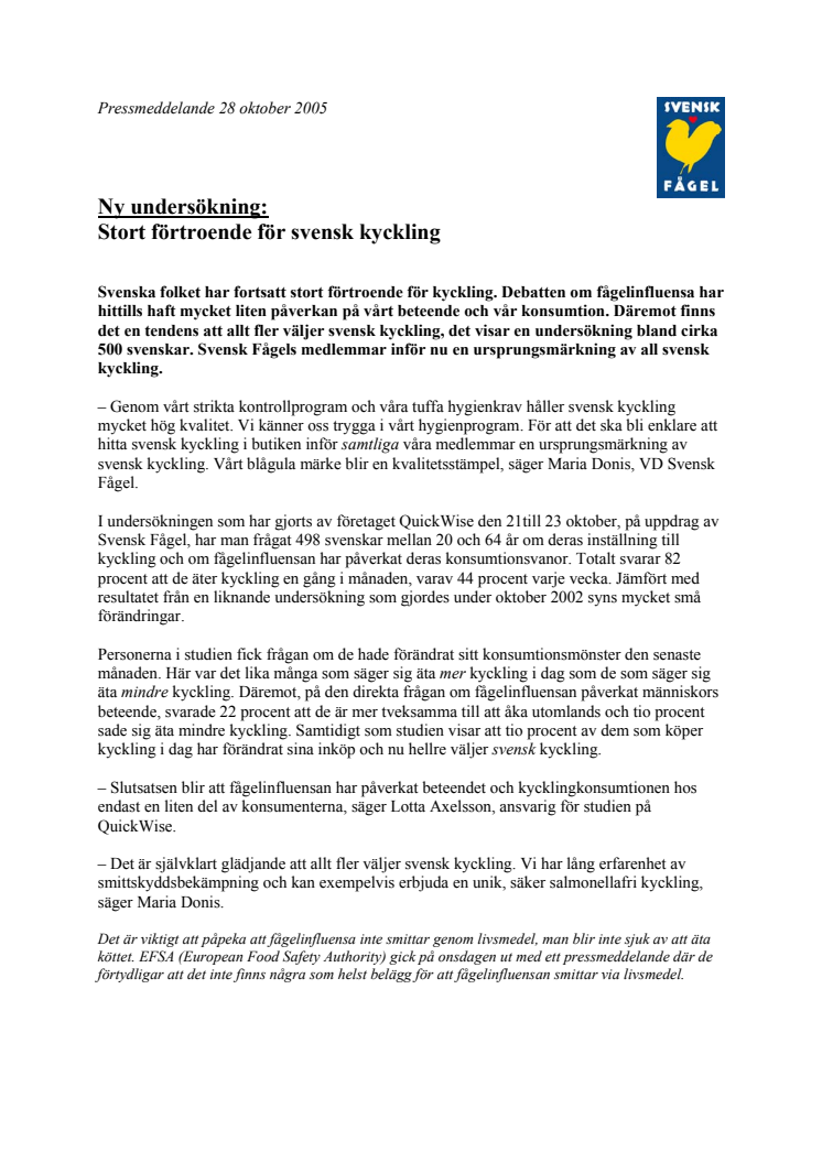 Svenska folket har fortsatt stort förtroende för kyckling. Debatten om fågelinfluensa har hittills haft mycket liten påverkan på vårt beteende och vår konsumtion. Däremot finns det en tendens att allt fler väljer svensk kyckling, det visar en undersökning bland cirka 500 svenskar. Svensk Fågels medlemmar inför nu en ursprungsmärkning av all svensk kyckling.