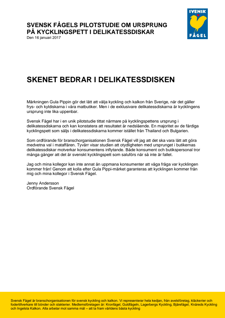 Svensk Fågel har genomfört en pilotstudie i delikatessdiskarna hos 71 stora matbutiker runt om i landet. När personalen fick frågan om kycklingspettens ursprung svarade de ofta att den var svensk men vid närmre kontroll med leverantören visade det sig merparten av spetten kom från Thailand och Bulgarien. I endast fem av de tillfrågade butikerna var kycklingspetten tillagade av svensk kyckling.