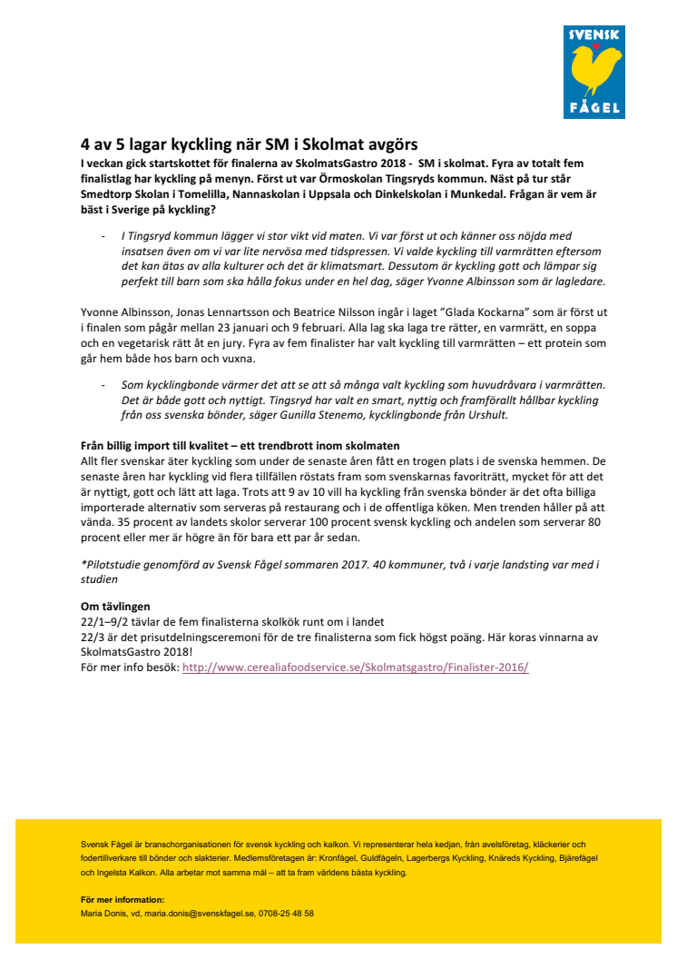 I veckan gick startskottet för finalerna av SkolmatsGastro 2018 - SM i skolmat. Fyra av totalt fem finalistlag har kyckling på menyn. Först ut var Örmoskolan Tingsryds kommun. Näst på tur står Smedtorp Skolan i Tomelilla, Nannaskolan i Uppsala och Dinkelskolan i Munkedal. Frågan är vem är bäst i Sverige på kyckling?