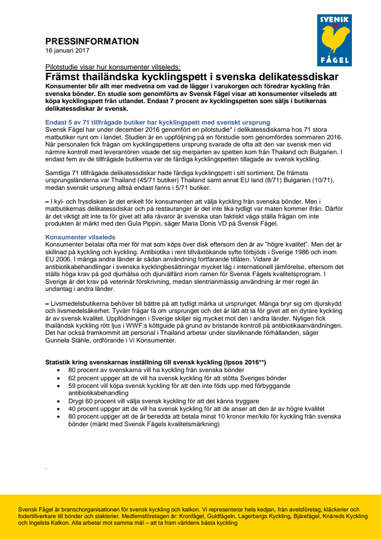 * Svensk Fågels pilotstudie om ursprung på kycklingspett har genomförts under december 2016 genom rundringning till 71 matbutiker med delikatessdiskar över hela Sverige. Motsvarande rundringning gjordes även under juni och juli 2016 i 50 matbutiker med liknande resultat som i december. I decembers utökade rundringning har ytterligare butiker tillförts för att öka pilotstudiens geografiska relevans. De tillfrågade matbutikerna finns lokaliserade i 15 svenska län/regioner från Region Skåne i söder till Norrbottens län i norr.