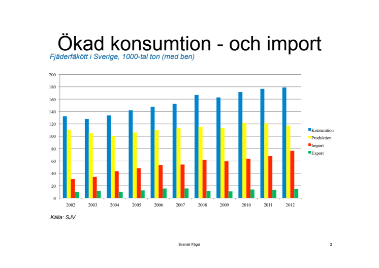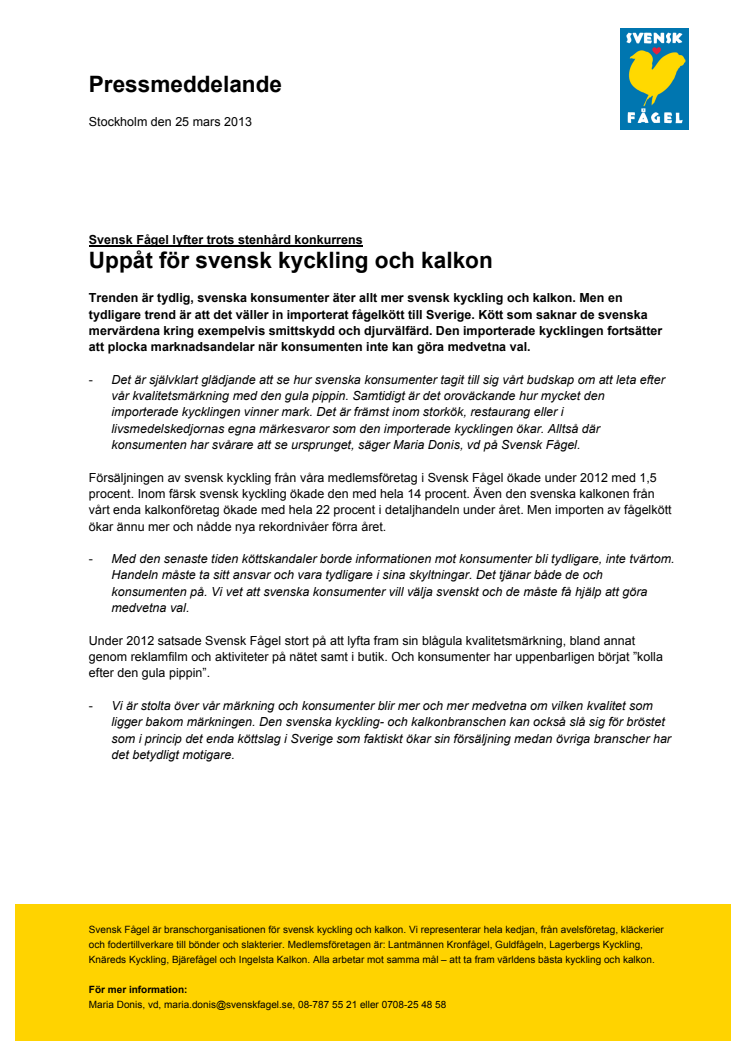 Försäljningen av svensk kyckling från våra medlemsföretag i Svensk Fågel ökade under 2012 med 1,5 procent. Inom färsk svensk kyckling ökade den med hela 14 procent. Även den svenska kalkonen från vårt enda kalkonföretag ökade med hela 22 procent i detaljhandeln under året. Men importen av fågelkött ökar ännu mer och nådde nya rekordnivåer förra året.