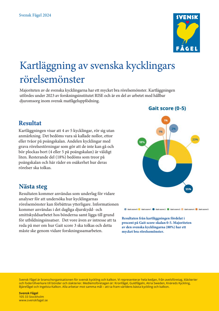 I en ny studie genomförd av forskningsinstitutet RISE visar även att majoriteten av svenska kycklingarna har ett mycket bra rörelsemönster. Kartläggningen som utfördes under 2023 är en del av arbetet med hållbar djuromsorg inom svensk matfågeluppfödning.
