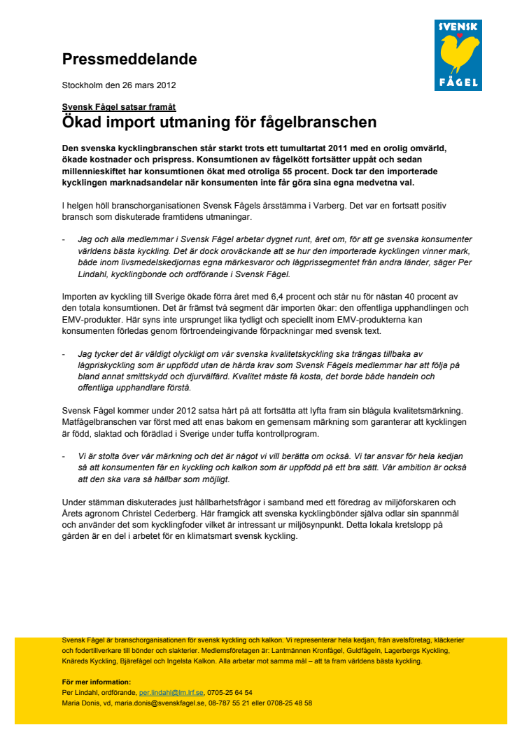 Den svenska kycklingbranschen står starkt trots ett tumultartat 2011 med en orolig omvärld, ökade kostnader och prispress. Konsumtionen av fågelkött fortsätter uppåt och sedan millennieskiftet har konsumtionen ökat med otroliga 55 procent. Dock tar den importerade kycklingen marknadsandelar när konsumenten inte får göra sina egna medvetna val.