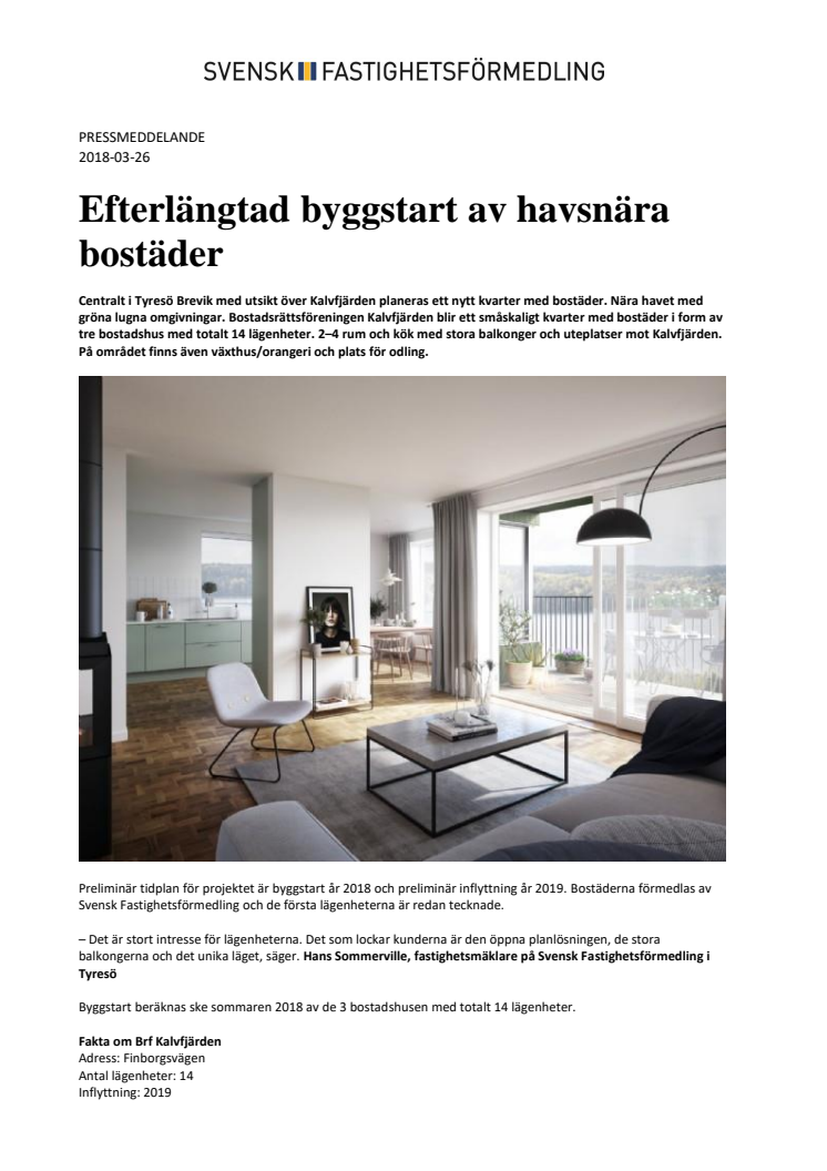 Centralt i Tyresö Brevik med utsikt över Kalvfjärden planeras ett nytt kvarter med bostäder. Nära havet med gröna lugna omgivningar. Bostadsrättsföreningen Kalvfjärden blir ett småskaligt kvarter med bostäder i form av tre bostadshus med totalt 14 lägenheter. 2–4 rum och kök med stora balkonger och uteplatser mot Kalvfjärden. På området finns även växthus/orangeri och plats för odling.