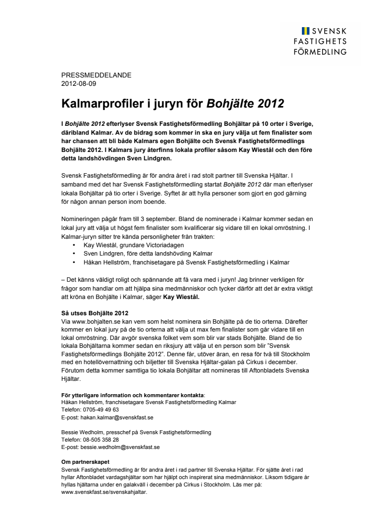 I Bohjälte 2012 efterlyser Svensk Fastighetsförmedling Bohjältar på 10 orter i Sverige, däribland Kalmar. Av de bidrag som kommer in ska en jury välja ut fem finalister som har chansen att bli både Kalmars egen Bohjälte och Svensk Fastighetsförmedlings Bohjälte 2012. I Kalmars jury återfinns lokala profiler såsom Kay Wiestål och den före detta landshövdingen Sven Lindgren.
