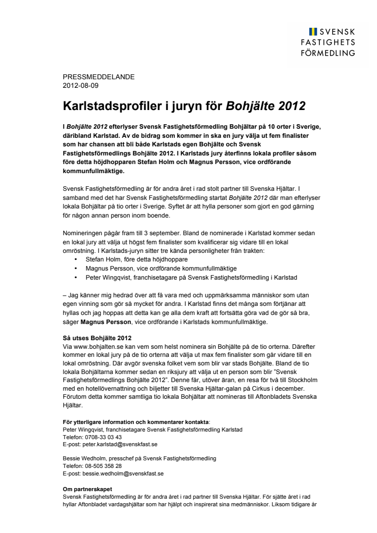 I Bohjälte 2012 efterlyser Svensk Fastighetsförmedling Bohjältar på 10 orter i Sverige, däribland Karlstad. Av de bidrag som kommer in ska en jury välja ut fem finalister som har chansen att bli både Karlstads egen Bohjälte och Svensk Fastighetsförmedlings Bohjälte 2012. I Karlstads jury återfinns lokala profiler såsom höjdhopparen Stefan Holm och Magnus Persson, vice ordförande kommunfullmäktige.