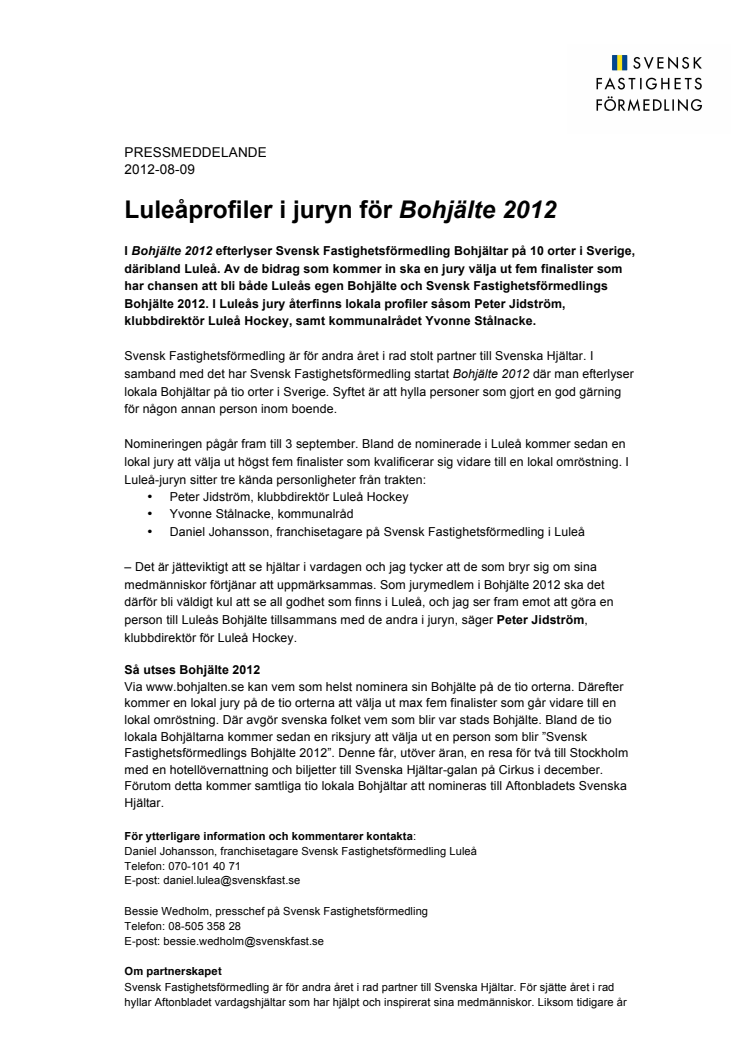I Bohjälte 2012 efterlyser Svensk Fastighetsförmedling Bohjältar på 10 orter i Sverige, däribland Luleå. Av de bidrag som kommer in ska en jury välja ut fem finalister som har chansen att bli både Luleås egen Bohjälte och Svensk Fastighetsförmedlings Bohjälte 2012. I Luleås jury återfinns lokala profiler såsom Peter Jidström, klubbdirektör Luleå Hockey, samt kommunalrådet Yvonne Stålnacke.