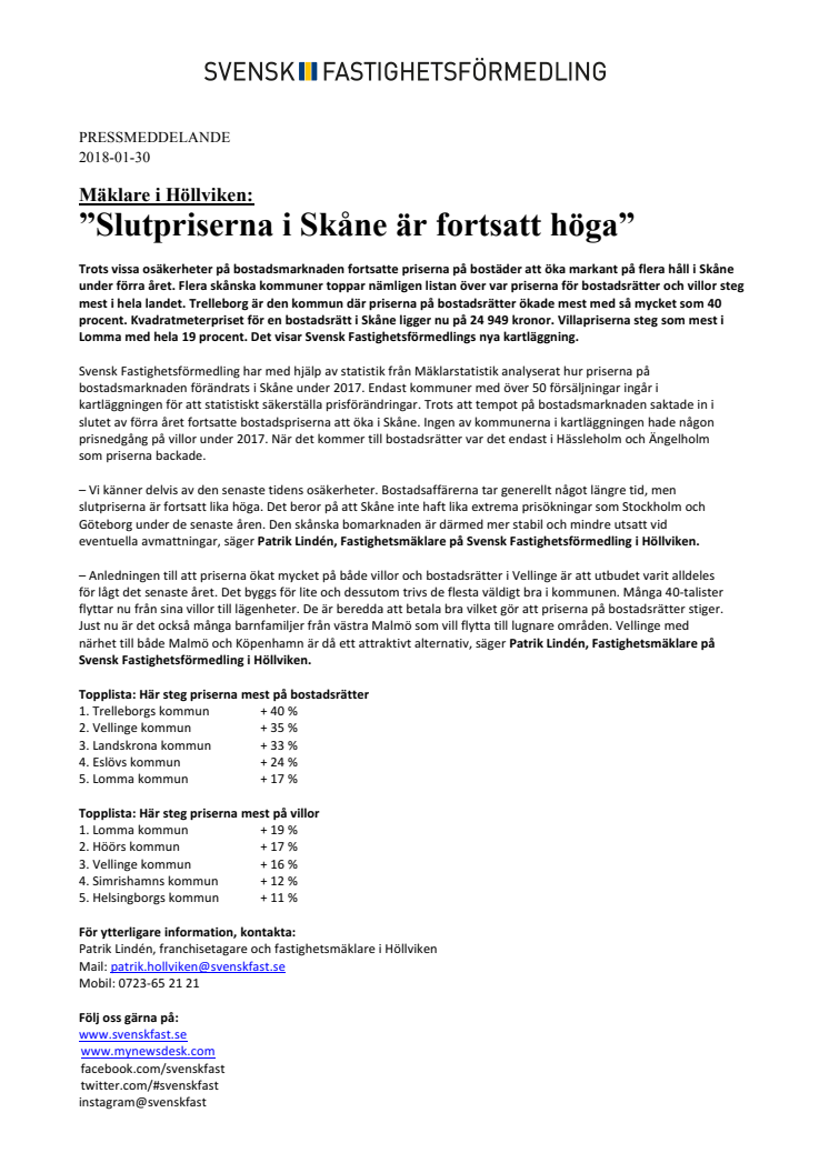 Trots vissa osäkerheter på bostadsmarknaden fortsatte priserna på bostäder att öka på flera håll i Skåne under förra året. Trelleborg är den kommun där priserna på bostadsrätter ökade mest med så mycket som 40 procent. Villapriserna steg som mest i Lomma med hela 19 procent. Det visar Svensk Fastighetsförmedlings nya kartläggning.