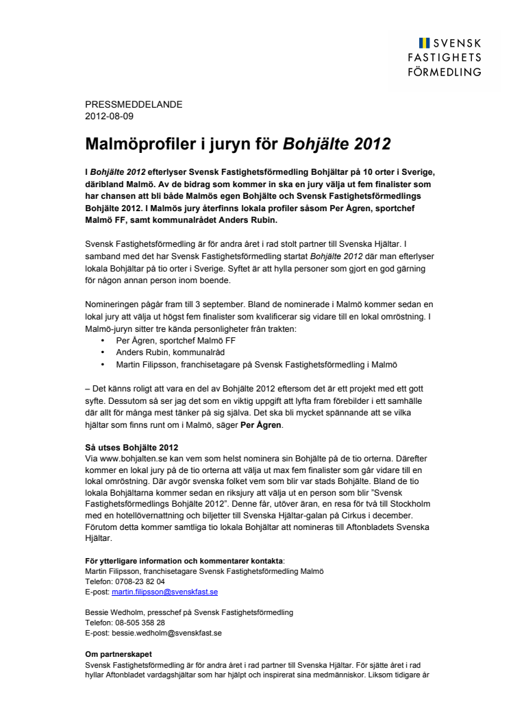 I Bohjälte 2012 efterlyser Svensk Fastighetsförmedling Bohjältar på 10 orter i Sverige, däribland Malmö. Av de bidrag som kommer in ska en jury välja ut fem finalister som har chansen att bli både Malmös egen Bohjälte och Svensk Fastighetsförmedlings Bohjälte 2012. I Malmös jury återfinns lokala profiler såsom Per Ågren, sportchef Malmö FF, samt kommunalrådet Anders Rubin.
