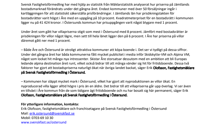 – Både Åre och Östersund är otroligt attraktiva kommuner att köpa boende i. Det ser vi tydligt på dessa siffror. Under det gångna året har båda kommunerna fått mycket publicitet i media inför Skidskytte-VM och Alpina VM, något som lockat hit många nya intressenter. Skistar Åre storsatsar dessutom med en ambition att bli Europas ledande alpina destination året runt, vilket också bidrar till att många vänder sig hit för fritidsboende. Dessa två faktorer har gjort att bostadspriserna naturligt ökat när övriga landet backat, säger ErikOlofsson, Fastighetsmäklare på Svensk Fastighetsförmedling i Östersund.